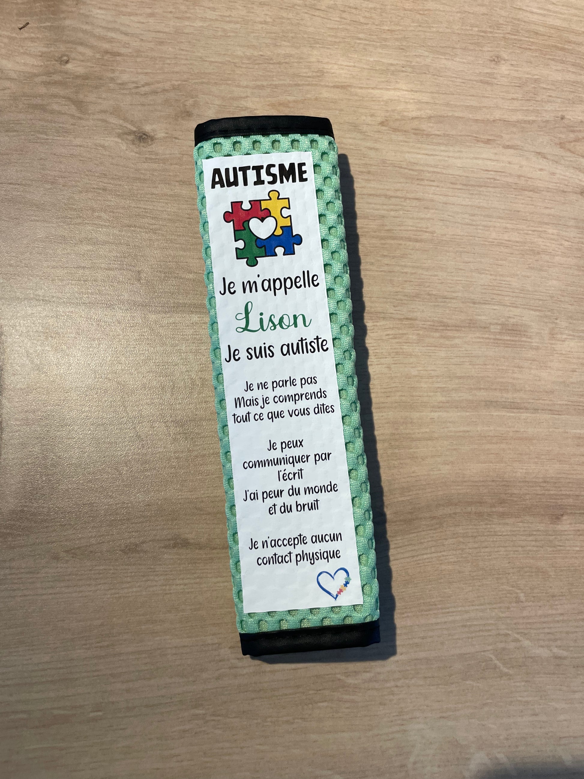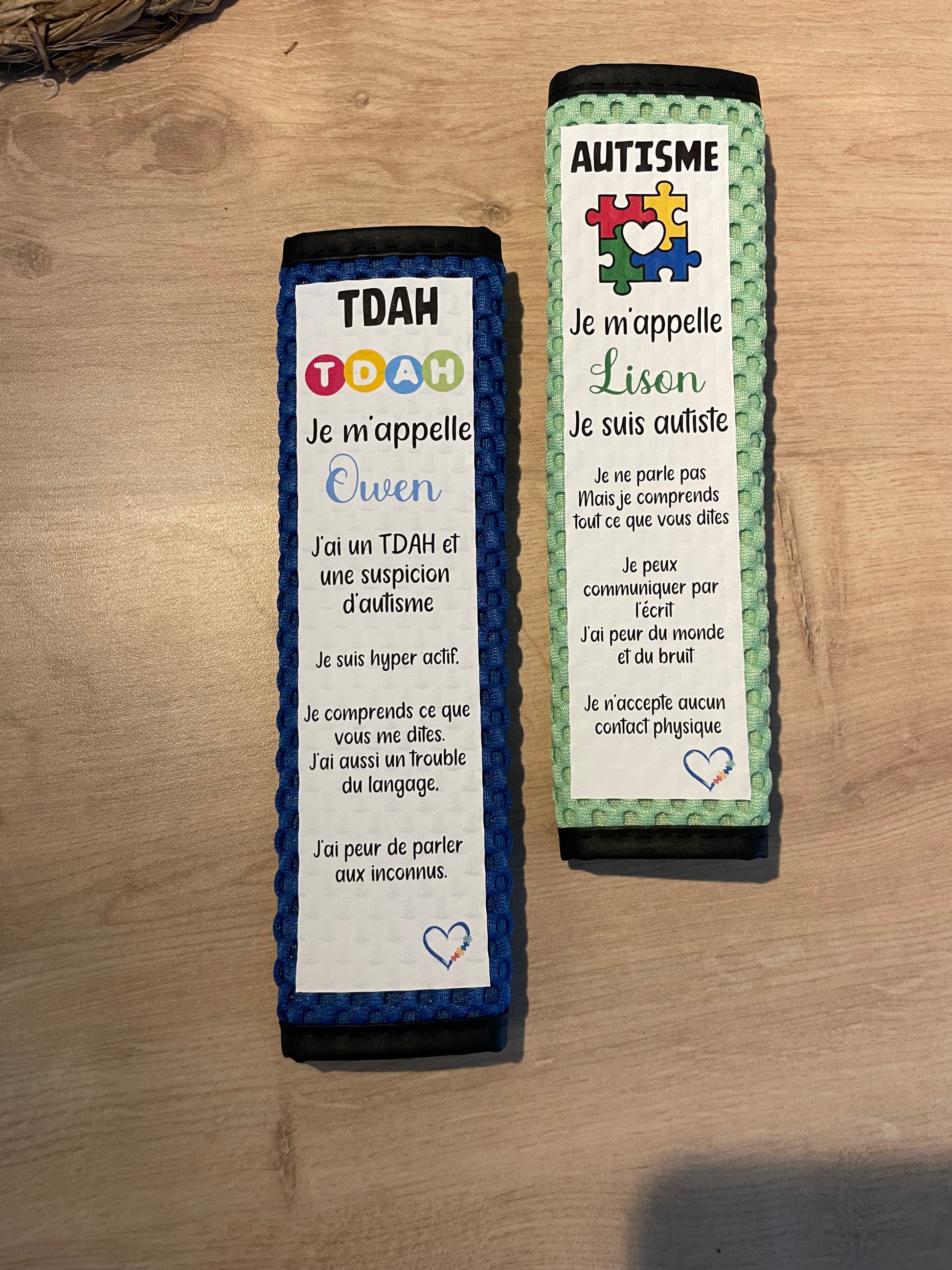 Pour créer votre protège ceinture, il vous suffit de me donner toutes les informations que vous souhaitez y voir apparaître. Par exemple : nom du trouble, prénom de l’enfant, date de naissance (pour que les secours connaissent son âge), et tout ce que vous souhaiteriez que les secours connaissent pour l’aider au mieux.