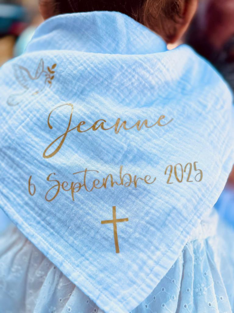 Vous recherchez un vêtement blanc pour le baptême de votre enfant ? Voici un lange 100% gaze de coton 70x70cm, personnalisé au prénom de l'enfant.